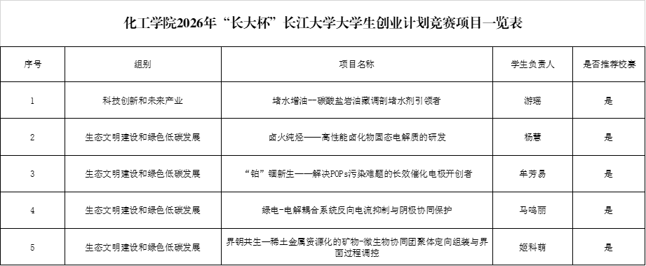 按照《关于举办2026年“长大杯”长江大学大学生创业计划竞赛暨“挑战杯”中国大学生创业计划竞赛校内选拔赛的通知》的要求,经过学生提交申请、江南体育 评审,拟推荐《堵水增油--碳酸盐岩油藏调剖堵水剂引领者》等5个项目申报校级挑战杯,具体名单如下。